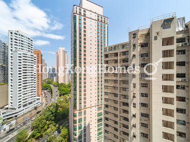 The apartment offers a view of the surrounding cityscape from the balcony located off the living room.