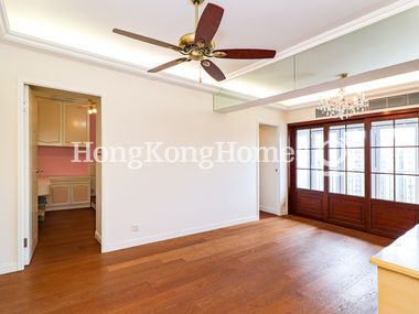 One wall of wooden storage and ceiling fan in the dining room and the wooden French doors and built-in cabinets in the living room are in old-Chinese style.