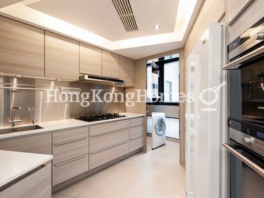 Kitchen with air-conditioning is accessed through a big sliding tinted glass door and features luxurious appliances including a four-hob gas stove with range hood, Western style oven and fridge/freezer.