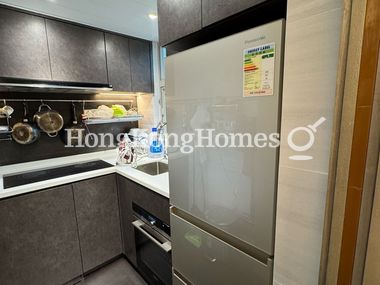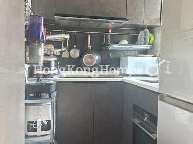 • The kitchen is equipped with essential appliances and built-in cabinets.