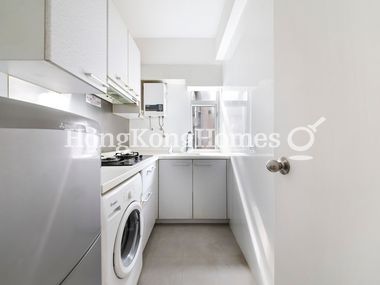 • The kitchen is equipped with essential appliances and built-in cabinets.