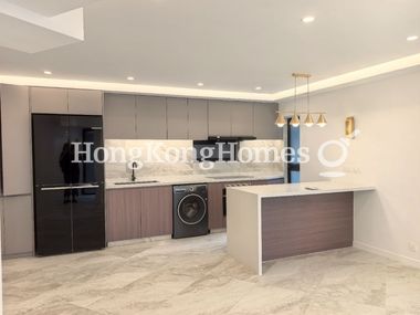 Fitted open kitchen comes with induction cooker, exhaust hood, built-in microwave & oven, built-in fridge, and washer & dryer.