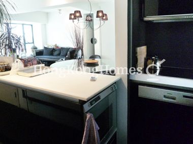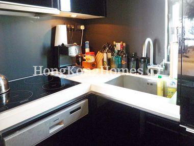 Kitchen with sleek black cabinets and top quality appliances including dishwasher, washer/dryer, electric hob and convection oven. Stainless steel butler sink.