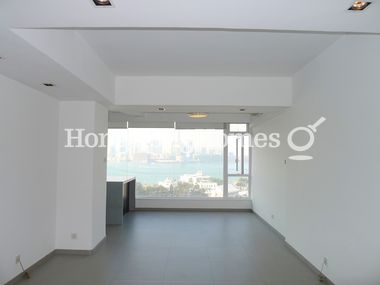 Long living and dining room with wall-to-wall windows and open kitchen feels extremely spacious and bright.