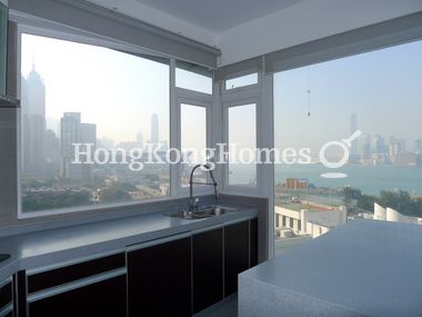 Large fully fitted kitchen with stunning 180-degree views from two glass walls features gas and electric hob, exhaust hood, microwave, fridge freezer, and washer dryer.