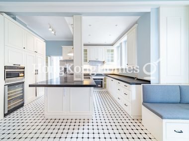 Family-sized dine-in kitchen features extended service top, ample storage cabinets, and built-in appliances such as gas hob, range hood, oven, microwave, and fridge.