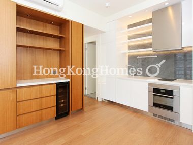 The open kitchen includes an oven, induction cooker, fridge freezer and wine fridge.