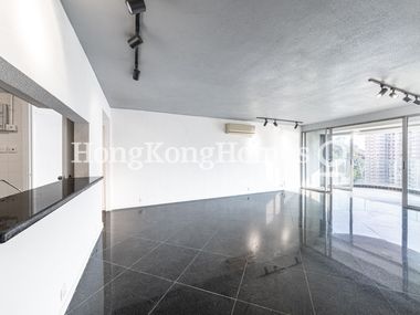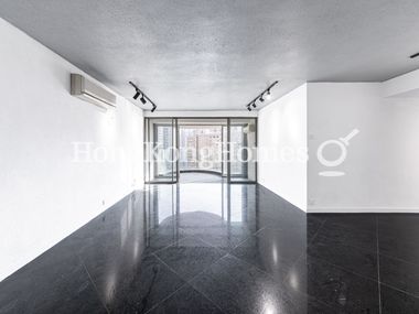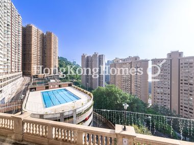 The balcony off the living and dining room offers a stunning view of the cityscape, complete with a pool and lush greenery.