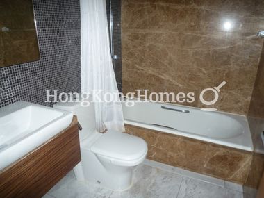 Bathroom has been tastefully designed with marble finishes and tiling.