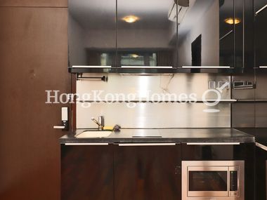 Open kitchen is equipped with essential appliances electric hob, built-in microwave, built-in fridge and washer.