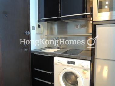 Fitted open kitchen is equipped with essential appliances and fitted with built-in cabinets.
