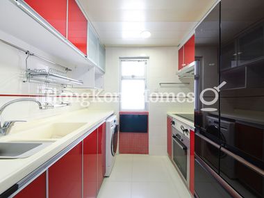 Fitted kitchen is equipped with essential appliances and built-in cabinets.