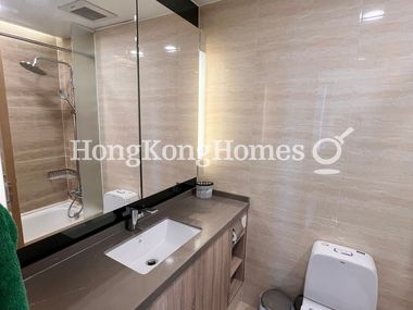 Bathroom has been tastefully designed with marble finishes and tiling.