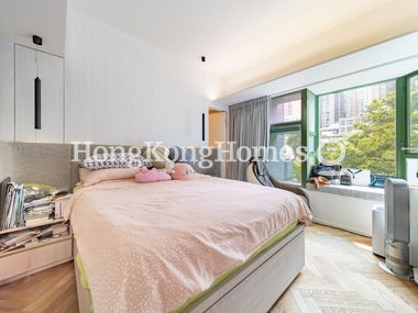 Master bedroom features huge L-shaped bay windows and includes built-in wall units and an ensuite bathroom with bathtub and cabinets.