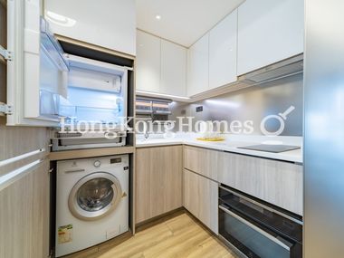 Fully fitted open kitchen is equipped with essential appliances and built-in cabinets.