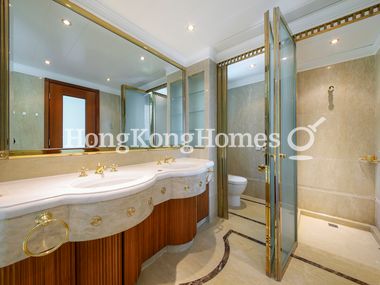 Huge master suite also benefitting from wall-to-wall windows contains dressing area, walk-in closet, and luxurious ensuite bathroom with bathtub and walk-in shower.