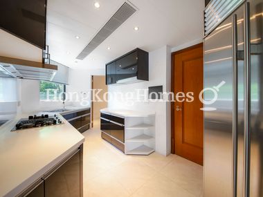 Top notch built-in appliances including ovens, microwave, gas hob, range hood and double-door refrigerator complete the chef's kitchen.
