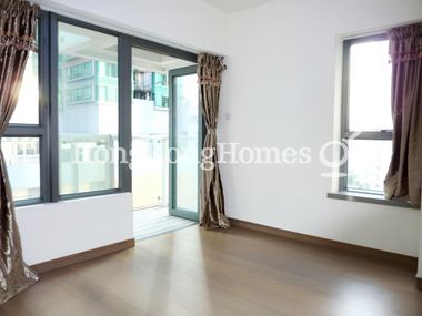 Bright and clean apartment with off-white paint, light-colour wooden flooring, curtains, and split-type air-con. Wall-to-wall bay windows and glass patio door bring in ample sunlight.