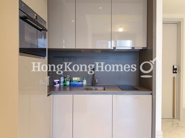 • The open kitchen is equipped with essential appliances with built-in cabinets.