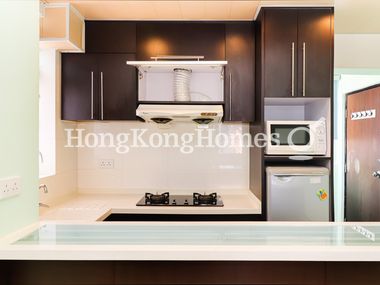 Fitted open kitchen comes with essential appliances and built-in cabinets.
